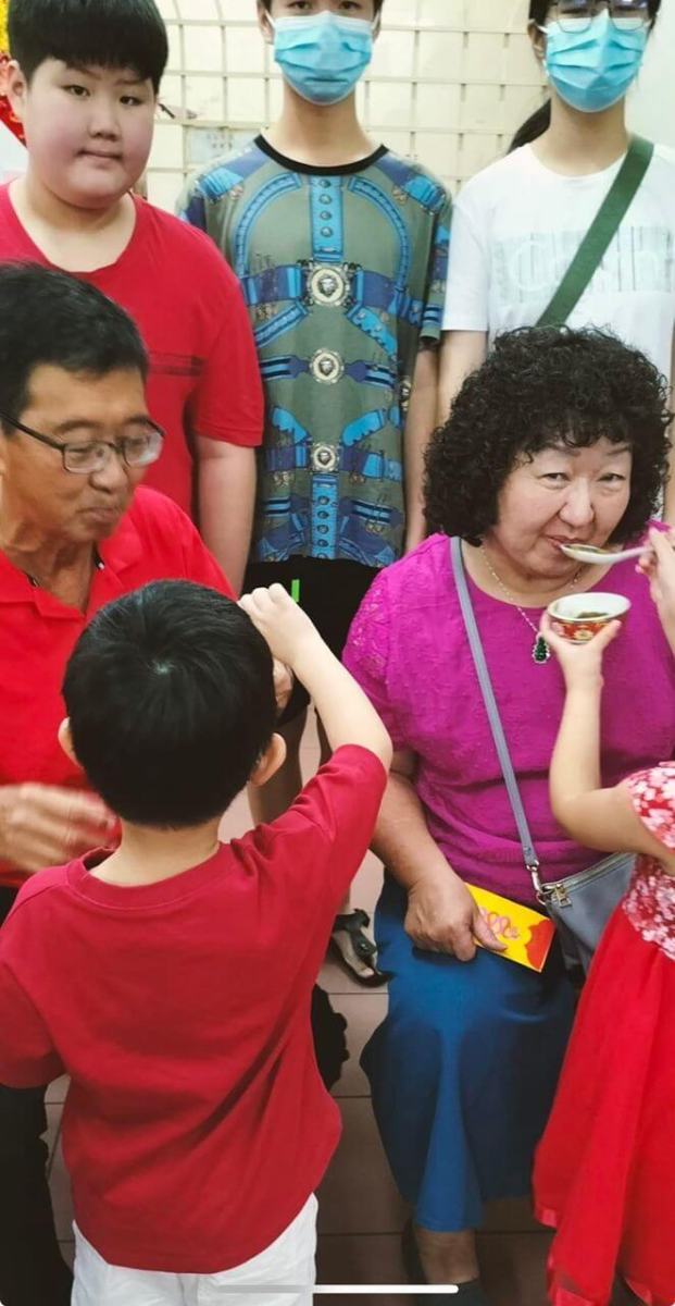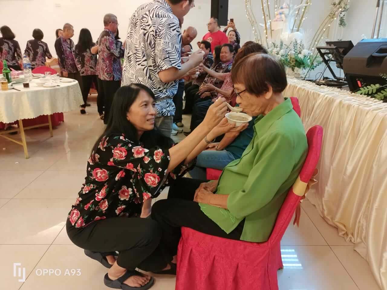 在介绍“拗九节”的典故后,大会挑选12组家庭,让晚辈喂长辈吃所准备的“拗九粥”,同时也向长辈敬茶和穿戴红彩带,长辈感动得拥抱孩子。