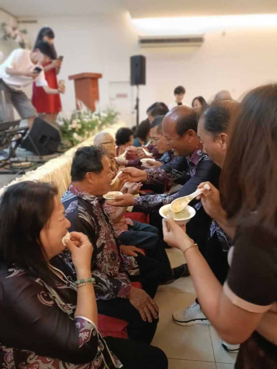 当天的午宴,大会不只为每一桌宾客准备了拗九粥,也特地安排了喂吃“拗九粥的环节。