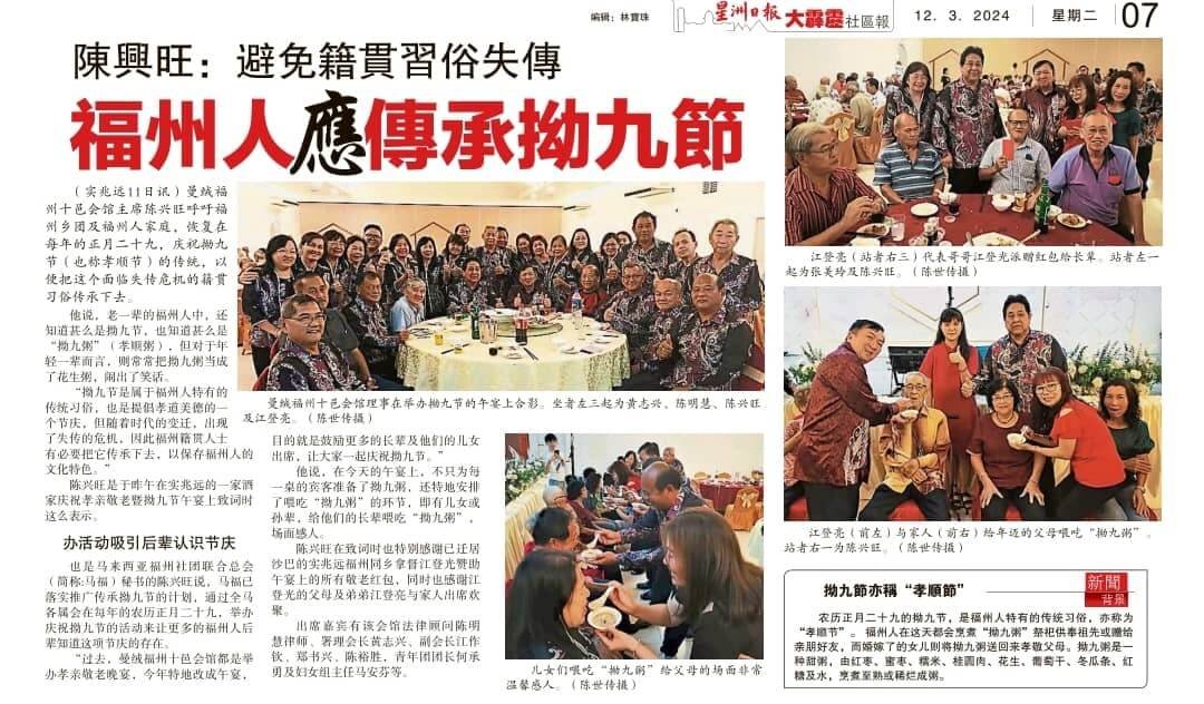 有鉴于此,西马福州十邑总会总会长拿督董仕星乡长在年前开始通过各管道以及在各个场合积极地呼吁各福州乡团及福州家庭重新推广这近乎被遗忘的传统节日,以培养后辈重视孝道。